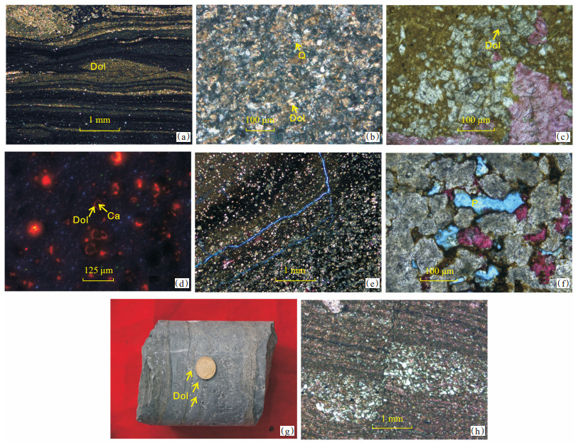 下载eps/tif图 图 3 额仁淖尔凹陷阿尔善组特殊岩类岩石学特征 Fig. 3 The petrologic characteristics of A'ershan Formation in Erennao'er Sag (a)泥晶纹层状云质泥岩,淖98井,3 20.62 m,单偏光;(b)局部放大的石英(Q),长石,白云石(Dol)组成的条带,含云泥岩,淖22井,1 749.56 m,单偏光;(c)云质泥岩,含微—细晶白云石,重结晶作用,淖29井,1 243.10 m,单偏光;(d)环带结构,白云石(Dol)交代方解石(Ca),云质泥岩,淖126井,1 615.50 m,阴极发光;(e)微裂缝,云质泥岩,淖98井,321.40 m,单偏光;(f)粒间孔,云质泥岩,淖98井,321.40 m,单偏光;(g)白云石(Dol)晶体,微裂缝,淖29井,1 243.10 m,岩心;(h)错断位移,钙质条带泥岩,淖47井,1 584.21 m,单偏光 |