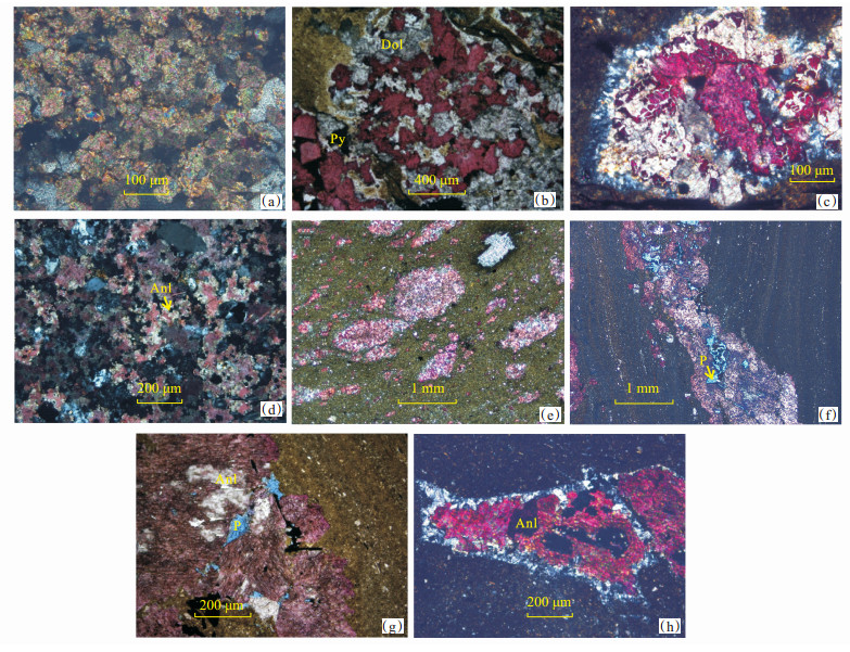 下载eps/tif图 图 4 额仁淖尔凹陷阿尔善组特殊岩类团块组合 Fig. 4 The combinations of dolomitic rocks of A'ershan Formation in Erennao'er Sag (a)白云石团块,云质沉凝灰岩,淖120井,1 754.00 m,正交光;(b)白云石(Dol)+方解石+长石团块,黄铁矿(Py)伴生,云质沉凝灰岩,淖120井,1 757.21 m,单偏光;(c)白云石+方解石+石英+长石团块,云质沉凝灰岩,淖120井,1 757.21 m,正交光;(d)白云石+方解石+石英+方沸石(Anl)+长石团块,云质沉凝灰岩,淖19井,1 474.77 m,正交光;(e)方解石团块,钙质沉凝灰岩,淖126井,1 665.99 m,单偏光;(f)方解石+石英团块,晶间孔,钙质沉凝灰岩,淖29井,1 242.35 m,单偏光;(g)方解石+方沸石团块,晶间孔,钙质泥岩,淖29井,1 242.35 m,单偏光;(h)方解石+石英+方沸石+长石团块,方解石交代方沸石(Anl),钙质沉凝灰岩,淖120井,1 754.61 m,正交光 |