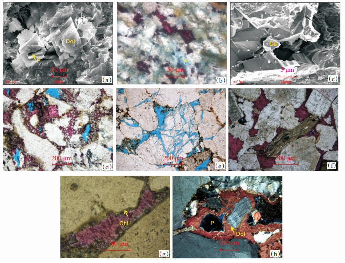 碳酸盐胶结可分为方解石胶结和白云石胶结,其中,方解石胶结又可分为早期和晚期。早期方解石胶结主要以较高的δ18O异常、较低的包裹体均一温度为特征[24]。钙质砂岩中的早期方解石多数为泥微晶产出,主要呈基底式胶结,但数量少且不易观察,可能与早期地层水中酸性物质和后期的溶蚀作用有关。早期方解石胶结物的存在,一方面直接充填了原生孔隙,另一方面有利于抑制压实作用,进而保存原生孔隙。镜下常观察到晚期方解石胶结物以基底式胶结为主,胶结许多经历过溶蚀作用的港湾状颗粒。在晚期铁方解石胶结之后,有少量流体进入部分甚至整个长石,形成铸模孔[图 5(h)]。薄片观察到长石颗粒在晚期方解石胶结之前经历了长石加大、白云石交代加大边的过程。由于碳酸盐胶结物形成时间较晚,大量充填成岩晚期仅存的剩余孔隙,对有效孔隙的形成破坏作用大,这种现象在其他地区也可见到[25]。在云(钙)质粉砂岩中,白云石主要以胶结物形式存在,充填了原生孔隙,使储层物性变差。因此,在碳酸盐胶结作用十分发育的情况下,储层物性较差;在碳酸盐溶蚀作用较强处,储层物性较好。
