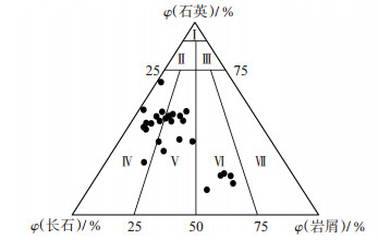 下载eps/tif图 图 6 额仁淖尔凹陷阿尔善组砂岩组分三角图 Fig. 6 Triangular diagram of sandstone composition of A'ershan Formation in Erennao'er Sag Ⅰ.石英砂岩;Ⅱ.长石石英砂岩;Ⅲ.岩屑石英砂岩;Ⅳ.长石砂岩;Ⅴ.岩屑长石砂岩;Ⅵ.长石岩屑砂岩;Ⅶ.岩屑砂岩 |