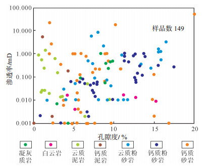 额仁淖尔凹陷阿尔善组149余块云质岩、钙质岩储层样品的统计数据表明,该区致密储层孔隙度为0.1%~20.0%,平均为7.44%;渗透率为0.01~50.5 mD,平均为1.11 mD。不同岩性的储层物性差别较大(图 7),其中,凝灰质岩的孔隙度平均为7.1%,渗透率平均为0.28 mD(因沉凝灰岩在研究区样品不多,故把含有凝灰质成分的岩石归为凝灰质岩,包括沉凝灰岩、凝灰质泥岩和凝灰质粉砂岩);云质粉砂岩的孔隙度平均为9.74%,渗透率平均为0.90 mD;云质泥岩的孔隙度平均为2.63%,渗透率平均为0.62 mD;钙质泥岩的孔隙度平均为1.7%,渗透率平均为0.05 mD;钙质粉砂岩的孔隙度平均为9.0%,渗透率平均为0.53 mD;钙质砂岩的孔隙度平均为7.76%,渗透率平均为2.59 mD。因此,这些云质岩、钙质岩等均属于致密储层。其中云(钙)质粉砂岩的孔隙度与渗透率相关性较好,明显好于钙质砂岩等,表明云(钙)质粉砂岩的原生孔隙相对较多,而钙质砂岩渗透率较好,粒内孔较发育。此外,钙质砂岩孔隙度低,说明胶结强度较大。