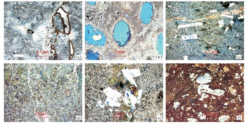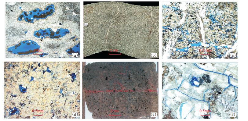 下载eps/tif图 图 2 西泉地区石炭系火山岩岩石学特征 Fig. 2 The micro and macro characteristics of Carboniferous volcanic rocks in Xiquan area (a)安山岩,少量气孔,XQ091井,2 499.03 m,铸体薄片,单偏光;(b)安山岩,杏仁状构造,杏仁体未被未被充填,XQ092井,2 507.71 m,铸体薄片,单偏光;(c)安山岩,碎裂现象明显,XQ3井,2 382.25 m,铸体薄片,单偏光;(d)玄武岩,气孔较少,XQ8井,2 506.85 m,铸体薄片,单偏光;(e)火山角砾岩,部分斑晶发生溶蚀,XQ9井,2 789.47 m,铸体薄片,单偏光;(f)凝灰岩,XQ7井,1 912.43 m,铸体薄片,单偏光 |