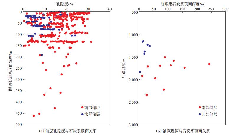 根据统计结果,北部构造带火山岩储层主要分布在距石炭系顶面之下105 m的深度范围内,与风化淋滤带的发育深度一致;南部构造带火山岩储层主要分布在距石炭系顶面之下250 m的深度范围内,与风化淋滤带的发育深度相同[图 4(a)]。试油成果显示,北部构造带发育的火山岩油藏主要分布在距离石炭系顶面之下50 m的深度范围内,南部构造带发育的火山岩油藏主要分布在距离石炭系顶面之下150 m的深度范围内[图 4(b)]。这些统计数据说明风化淋滤作用随着距离顶面深度的增加而减弱,南部构造带遭受的风化淋滤作用强于北部构造带。