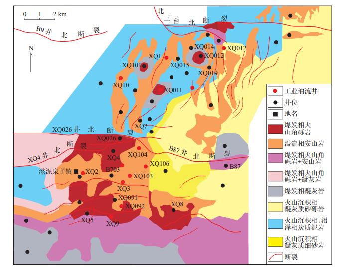 下载eps/tif图 图 5 西泉地区石炭系顶面300 m范围内火山岩岩相分布 Fig. 5 The distribution of volcanic lithofacies of 300 m from the top of the Carboniferous in Xiquan area |