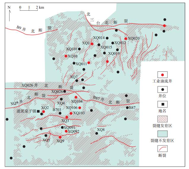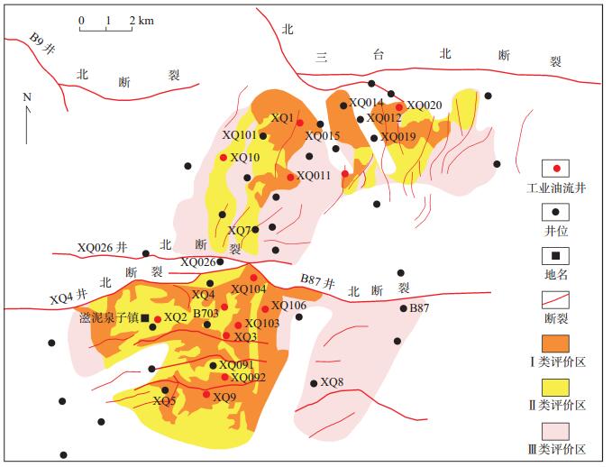 4.4 有利储层预测结合构造发育位置、岩性岩相分布特征及裂缝预测结果,对西泉地区石炭系有利储层进行了预测(图 7)。从图 7可以看出,南部构造带有利储层主要分布于构造高点、裂缝发育区(参见图 6),岩性以火山角砾岩、凝灰岩等喷出岩为主(参见图 5),Ⅰ类有利储层主要分布于XQ5井—XQ9井一带、XQ3井—XQ103井—XQ104井一带、XQ106井及其南侧一带、B703井南一带及XQ4井—XQ104井一带,Ⅰ类有利储层的外围为Ⅱ类有利储层发育区;相比之下,北部构造带有利储层发育范围较小,主要受控于构造高点,岩性以安山岩等溢流相火山岩为主(参见图 5),Ⅰ类有利储层主要分布于XQ1井周围、XQ011井以西一带、XQ014井南—XQ019井西一带及XQ020井南—XQ019井东一带,Ⅱ类有利储层同样分布于Ⅰ类有利储层的外围(图 7)。