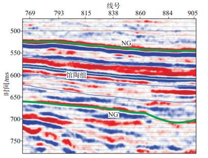 2.1 不整合面馆陶组冲积扇是一套砂砾岩沉积,顶、底均为不整合面,在地震及测井资料中均较易识别。结合地震资料,研究区馆陶组顶面对应NG反射层,其上覆地层明化镇组下部为灰绿色泥岩夹灰白色块状砂砾岩,与下伏馆陶组之间存在明显的波阻抗界面,该界面地震反射能量较强,主要表现为中强振幅、连续反射特征;馆陶组底面对应NG'反射层,地震剖面上的反射特征不明显,表现为波状中振幅,NG'界面之上,可见明显的超覆和沟谷充填现象,NG'界面之下可见明显的削截现象(图 2)。不整合面在测井曲线上同样具有明显的识别特征,馆陶组声波时差曲线呈明显的低幅特征,馆陶组之上及之下地层声波时差值均明显增高,馆陶组顶、底不整合面声波时差值均存在明显突变。