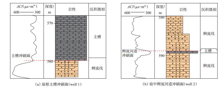 由于冲积扇扇根以主槽为主要沉积微相类型,冲积扇扇中以辫流线为主要沉积微相类型,故河道冲刷面在冲积扇层序中极为常见。由于分布面积和所属级次的限制,河道冲刷面并不都具有全区等时地层对比意义,有些仅在局部具有对比意义,所以在进行高分辨率层序地层对比时需要选取具有区域等时对比意义的河道冲刷面作为层序界面。冲积扇内部具有2种典型的河道冲刷面,一种为扇根主槽冲刷面[图 3(a)],另一种为扇中辫流河道冲刷面[图 3(b)]。
