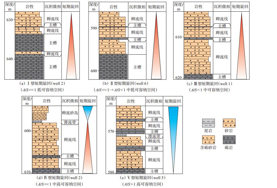 3.2.2 短期旋回的类型短期旋回由具有成因联系的多组微相组合而成,按照可容纳空间的大小,短期旋回可划分为5种类型,分别为Ⅰ,Ⅱ,Ⅲ,Ⅳ和Ⅴ型(图 4),顶界面均为扇中辫流河道冲刷面。
