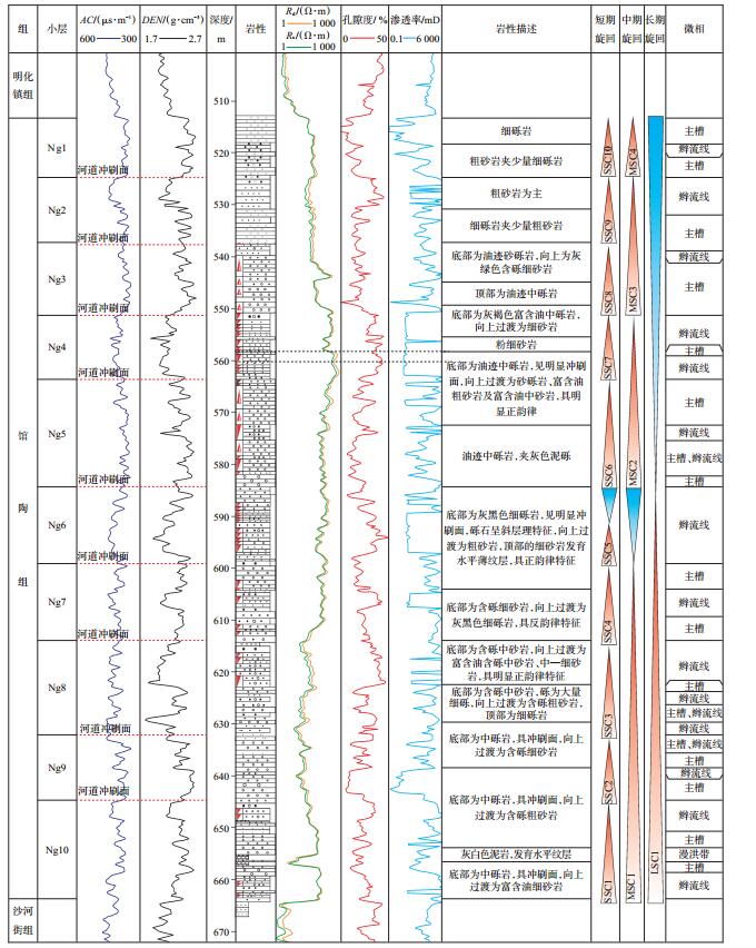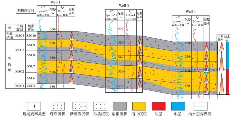 由于馆陶组整体为单斜构造,早期成藏时,油气聚集于构造上倾方向,因而冲积扇扇根及扇中前缘为油气富集区。后期馆陶组油藏受到强烈的生物降解作用[17],从而形成超稠油,垂向上形成油水倒置关系。结合电阻率曲线可知,馆陶组油层主要分布于馆陶组下部的MSC1和MSC2中期旋回内,而水层集中分布于馆陶组上部的MSC3和MSC4中期旋回内。