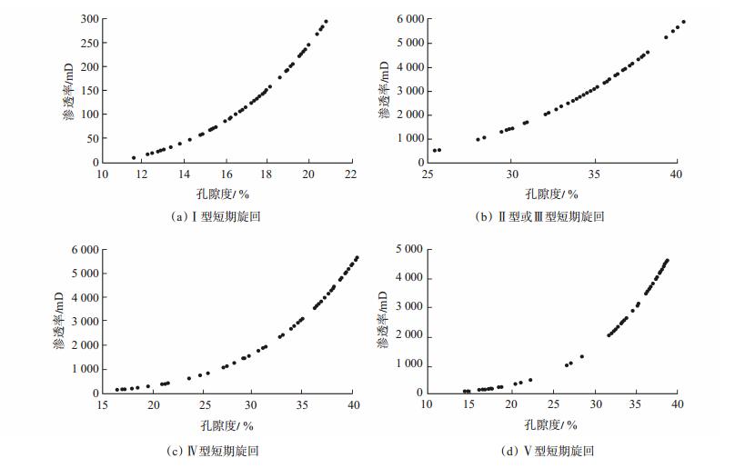5 高分辨率层序地层与冲积扇储层物性的关系垂向上,短期旋回类型受控于其在中期旋回中的位置,而短期旋回类型与储层物性存在对应关系。Ⅰ型短期旋回形成于低可容纳空间背景下,储层物性最差,孔隙度主要为12%~20%,渗透率为20~300 mD,整体为大套砾质沉积,物性极差,内部易形成物性隔层;Ⅱ型或Ⅲ型短期旋回形成于中等可容纳空间背景下,储层物性最优,孔隙度主要为25%~40%,渗透率为1 000~6 000 mD,砂体互相叠置切割,形成大面积连片分布、垂向连通的砂砾岩体;Ⅳ型短期旋回对应的储层物性居中,孔隙度主要为15%~35%,渗透率变化幅度较大,渗透率为0~5 000 mD,砂体底部物性较好,向上物性逐渐变差,内部易形成泥质夹层;Ⅴ型短期旋回对应的储层物性与Ⅳ型短期旋回相似,孔隙度主要为15%~ 35%,渗透率为0~5 000 mD,砂体相对孤立,整体物性相对中等(图 7)。