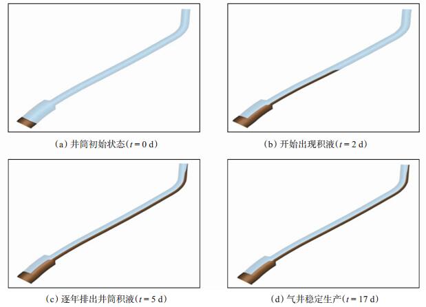 下载eps/tif图 图 4 地层压力衰竭时M井井筒积液的动态物理过程 Fig. 4 Dynamic process of wellbore liquid loading considering formation pressure drop |