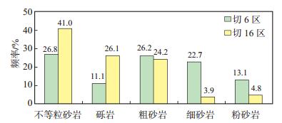 昆北油田路乐河组储集层属于中低孔、中低渗型,且物性变化大,总体储集性能较差。该区储集层孔隙度为5.0%~27.2%,平均为10.6%;渗透率为0.3~509.1 mD,平均为10.0 mD(表 1)。按照薄片鉴定结果对昆北油田路乐河组储集层岩石颗粒大小进行分类,切6区和切16区均以不等粒砂岩为主,其体积分数分别为26.8%和41.0%,其次为粗砂岩、砾岩和细砂岩及少量粉砂岩(图 1)。