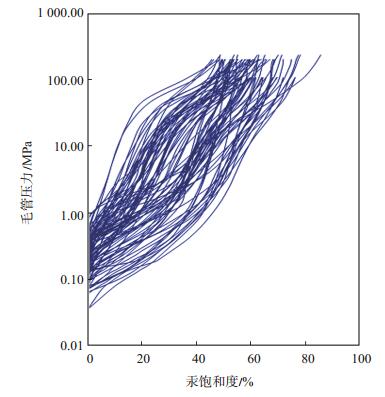 下载eps/tif图 图 2 昆北油田路乐河组砂砾岩储集层毛管压力曲线 Fig. 2 Capillary curves of the glutenite reservoir of Lulehe Formation in Kunbei Oilfield |