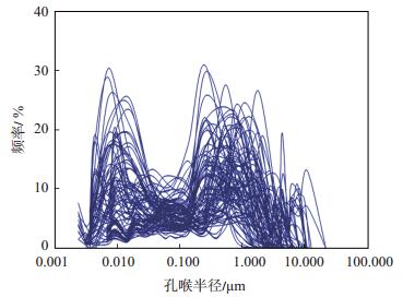 (2)该油田储集层岩石孔喉分布具有明显的双峰特征,甚至存在多峰,说明孔喉大小分布广,存在“大孔”和“小孔”,具有类似“双重孔隙介质”孔隙结构特征(图 3)。