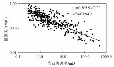 下载eps/tif图 图 4 昆北油田路乐河组砂砾岩储集层岩石渗透率与排驱压力的关系 Fig. 4 Relationship between reservoir permeability and threshold pressure of the glutenite reservoir of Lulehe Formation in Kunbei Oilfield |