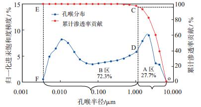 下载eps/tif图 图 5 储集层岩石中“主要流动空间百分数”及累计渗透率贡典型示意图 Fig. 5 Typical diagram of the accumulated permeability contribution and the percentage of main flowing space in a reservoir rock |