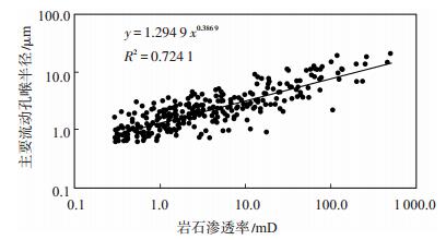 相应地,由式(6)求出“主要流动孔喉半径平均值”为0.60~20.4 μm,平均为2.81 μm(表 2)。主要流动孔喉半径反映了储集层中“大孔”对应的平均半径,其值与岩石渗透率存在较好相关性,渗透率越高,主要流动孔喉半径越大(图 6)。