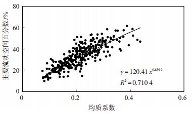 按式(7)对选取的该区339块压汞分析样品进行计算,均质系数为0.08~0.44,平均为0.21(表 2)。将均质系数与“主要流动空间百分数”进行回归分析,发现两者之间存在较好相关性(图 7),孔隙结构非均质性越强,均质系数越小,其“主要流动空间百分数”也越低。