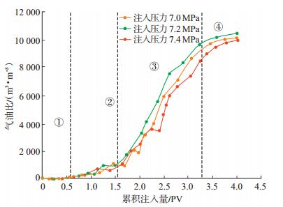 下载eps/tif图 图 4 气油比随注入量的变化特征 Fig. 4 Characteristics of gas oil ratio change with injection quantity |
