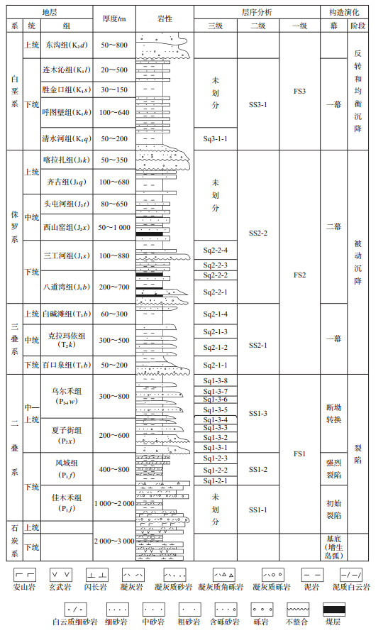 本次研究的目的层主要集中在二叠系—下白垩统。其地层发育特征如下:下二叠统佳木禾组(P1j)不整合上覆于上石炭统砂砾岩地层之上,其下部发育火山碎屑岩、砂砾岩,上部为紫红色、灰色泥岩夹凝灰岩、砂岩,是一套以发育冲积扇和湖沼环境为主的地层。风城组(P1f)不整合上覆于佳木禾组之上,主要发育一套深灰色泥岩、油页岩夹泥质白云岩、白云岩、粉砂岩和砂砾岩,是一套以咸水湖泊和扇三角洲为主的沉积地层。夏子街组(P2x)不整合上覆于风城组之上,岩性为砂砾岩、砂岩夹灰色泥岩,属于辫状河到辫状河三角洲前缘沉积。乌尔禾组(P2-3w)整合上覆于夏子街组之上,岩性为砂岩、含砾砂岩与灰色、灰绿色泥岩互层,也属于辫状河到辫状河三角洲沉积[25]。乌尔禾组与上覆三叠系百口泉组(T1b)地层呈明显的角度不整合接触,百口泉组岩性是砂砾岩夹灰绿色、红色泥岩及砂质泥岩,是一套冲积扇到扇三角洲沉积地层。克拉玛依组(T2b)为砂砾岩、砂岩夹灰色泥岩,局部见煤线,是一套辫状河和辫状河三角洲沉积。白碱滩组(T3b)为灰色泥岩夹砂岩、粉砂岩地层,属于浅湖到三角洲沉积组合。侏罗系八道湾组(J1b)不整合覆盖于白碱滩组之上,岩性为砂砾岩、砂岩夹灰色泥岩、煤层,是一套辫状河到辫状河三角洲沉积组合。三工河组(J1s)中下部发育砂岩、砾岩夹灰色泥岩,属于辫状河三角洲沉积,上部发育灰色、深灰色泥岩夹砂岩,属于深湖、浅湖到河流—三角洲相沉积[8]。西山窑组(J2x)上覆于三工河组之上,其岩性为砂岩、粉砂岩夹灰色泥岩和煤层,属于曲流河三角洲沉积。头屯河组(J2t)岩性为红色泥岩夹砂岩和细砂岩,属于干旱气候下的滨浅湖到泛滥盆地沉积。齐古组(J3q)上覆于头屯河之上,发育红色泥岩夹细砂岩,属于泛滥盆地沉积。喀拉扎组(J3k)由厚层砂砾岩、砂岩地层组成,发育多个冲刷面,是冲积扇和辫状河相沉积。下白垩统清水河组(K1q)底部发育粗砂岩,上部发育灰绿色、灰色、深灰色泥岩,是一套流河—三角洲及湖泊相沉积。呼图壁组(K1h)岩性为细砂岩与灰色泥岩互层,是一套浅湖沉积。胜金口组(K1s)为厚层灰色泥岩,是一套半深湖沉积。连木沁组(K1l)岩性为灰绿色泥岩夹细砂岩,是一套滨浅湖到河漫滩沉积。