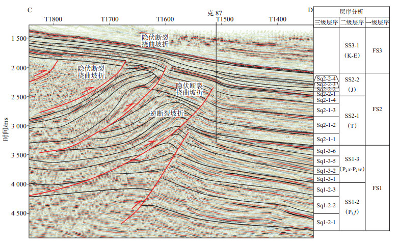 三叠纪末至早白垩世,盆地挤压坳陷活动减弱,早期的逆断层转化为隐伏断裂,在盆地边缘发育了一系列隐伏断裂坡折。该隐伏断裂坡折控制了二级层序SS2-1 (三叠系)、SS2-2 (侏罗系)至SS3-1 (下白垩统)内三级层序建造的发育。