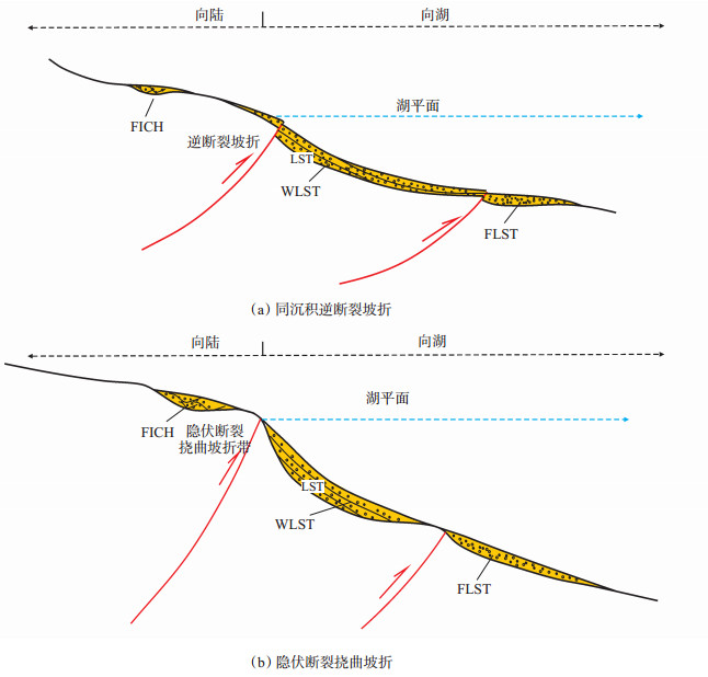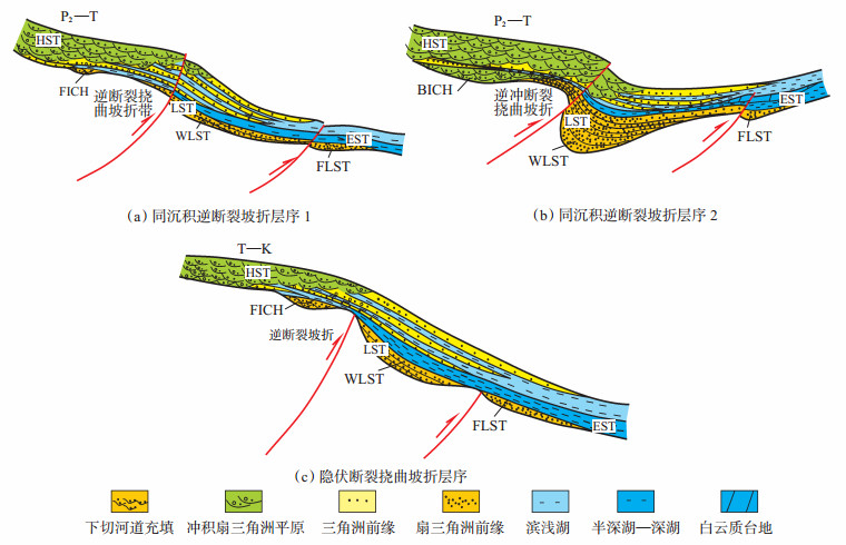 同沉积逆断裂坡折是指由同沉积逆断裂的长期构造活动造成的沉积斜坡坡度明显突变的部位[图 5(a)]。它主要发育在中—晚二叠世(P2-3)裂陷萎缩反转—三叠纪盆地挤压整体沉降阶段同沉积逆断裂发育的部位(图 3~4)。同期的挤压构造变形,可形成逆断裂坡折。由于逆断裂的活动,使坡折向湖一侧的新增可容纳空间增长速率相对增大,低位域可保留低位楔砂砾岩体(WLST)和低位扇砂体(FLST)。坡折向岸一侧可容纳空间增长速率减小或为负值,低位域可保留下切水道充填砂砾岩体(FICH)[图 5(a)]。