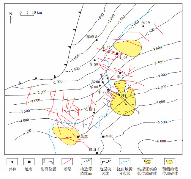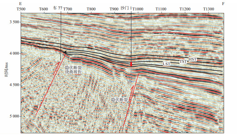 以车排子凸起边缘为例,隐伏断裂挠曲坡折带向湖一侧发育成群分布的低位域砂体(图 8)。现已钻探了沙门1井,在清水河组Sq3-1-1层序,低位域钻遇油层。该层序低位域在隐伏坡折向湖一侧发育低位三角洲砂体(岩性圈闭),其储层物性好。湖扩展体系域(EST)半深湖泥岩覆盖其上,形成良好的储盖组合,隐伏断裂作为沟通深层烃源岩和砂体的输导系统,能使低位域砂体成藏(图 7)。其他未被钻探的沿坡折向湖一侧发育的低位域砂体,应该也是岩性油气藏勘探的有利目标(图 8)。
