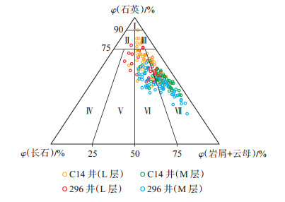下载eps/tif图 图 2 老君庙构造间泉子段储层岩性三角图 Ⅰ.石英砂岩;Ⅱ.长石石英砂岩;Ⅲ.岩屑石英砂岩;Ⅳ.长石砂岩;Ⅴ.岩屑长石砂岩;Ⅵ.长石岩屑砂岩;Ⅶ.岩屑砂岩 Fig. 2 Triangular diagram showing rock composition of Jianquanzi member in Laojunmiao structure |