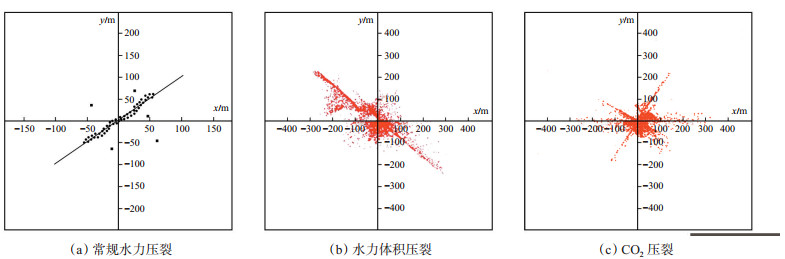 超临界或液态CO2的黏度不足水基压裂液的1/100[22],扩散性约为水的10倍,压裂时具有更好的贯穿能力。在裂缝延伸过程中CO2能够进入水基压裂液无法进入的微小孔隙,这能增加裂缝扩展压力,降低地应力对裂缝扩展方位的制约,有效地沟通地层天然裂缝,形成更加复杂的裂缝网络[23-24]。进一步研究表明,CO2压裂形成的裂缝可有效引导后续水力压裂裂缝的扩展,这能促进形成具有高导流能力的复杂立体缝网(图 3),增加储层改造体积。