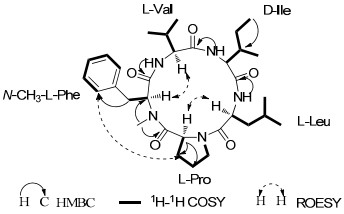 Advanced Marfey's method was applied to identify the configuration of the amino acid, and showed the presence of L-Leu as well as L-Val. The configurations of N-MePhe1, Pro2, Leu3, Ile4 and Val5 were determined to be L, L, L, D, L respectively by the application of the Marfey's method, the analysis of ROESY correlations (Table 1 and Figure 1) and the comparison with the data of cyclo(N-methyl-L-Phe-L-Pro-L-Leu-D-Ile-L-Val).16