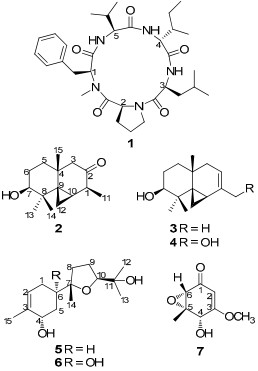 Fungi of the genus Xylaria are known to produce many types of bioactive compounds. Previous studies revealed that isopimarane diterpene glycosides,1 xylopimarane,2 4, 6, 8(14), 22-tetraen-3-one,3 xylarisin,4 coloratin A,5 kolokoside A,6 cytochalasins,7 clonostachydiol,7 xylobovide,7 07H239-A,8 cytochalasin D,9 multiplolides A and B,10 sordaricin,11 mellisol,12 1, 8-dihydroxynaphthol 1-O-α-glucopyranoside,12 benzoquinones,13 and integric acid14 from some species of this genus showed diverse pharmacological properties, including cytotoxic, antimicrobial, antifungal, anthelmintic, antivirus, and antimalarial activities. But the chemical constituents of Xylaria carpophila have received little attention. Our current investigation on the cultures of X. carpophila led to the isolation of one known cyclopeptide, cyclo(N-methyl-L-Phe-L-Pro-L-Leu-D-Ile-L-Val) (1), five new sesquiterpenes, named as xylcarpins A–E (2–6), and one known compound (7). The structures of cyclo(N-methyl-LPhe-L-Pro-L-Leu-D-Ile-L-Val) (1), and xylcarpins A–E (2–6) were elucidated by means of spectroscopic methods. The known compound (7) was identified as (4S, 5S, 6S)-5, 6-epoxy-4-hydroxy-3-methoxy-5-methyl-cyclohex-2-en-1-one15 by comparison with data in the literature. All of these compounds were tested for their cytotoxicities against five human cancer cell lines.