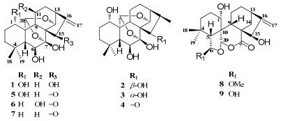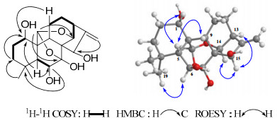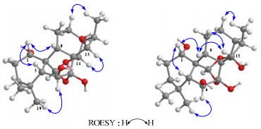 In ROESY spectra, H-1 correlated to H-5β and H-9β, H-6 to Me-19, H-15 to H-13α and H-14β, revealed H-1, H-6, H-15 to be β-, α-, α-oriented, respectively (Fig. 1). Thus, compound 1 was determined to be 1α, 6β, 7β, 15β-tetrahydroxy-7α, 20:14α, 20 -diepoxy-ent-kaur-16-ene.