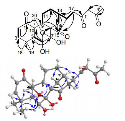 In the ROESY spectrum of compound 1, the NOE correlations for Me-19/H-6, H-6/H2-20, H-20a/H-14a, H-13/H-16, and H-16/H2-14 suggested that H-6, H-13, C-14, H-16, Me-19, and C-20 adopted the same α-orientation. The cross-peaks observed between H-5/H-9, H-5/Me-18, and H-9/H2-17 in the ROESY spectrum demonstrated that H-5, H-9, C-17, and Me-18 all possessed the same β-orientation. (Figure 2) Therefore, compound 2 was 6β, 7β-dihydroxy-17-(butyl 1', 3'-dione)-7α, 20-epoxy-ent-kaur-2-en-1, 15-dione, and named laxiflorin S.