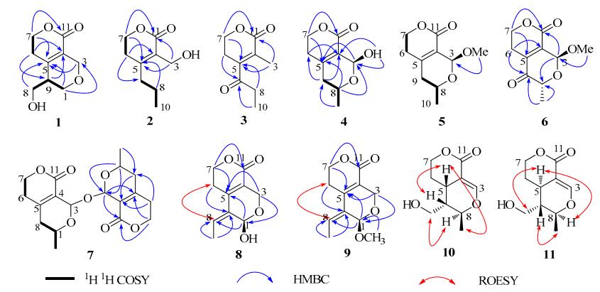 Compound 4 was obtained as a hemiacetal analogue with the molecular formula of C9H12O4 by a positive HRESIMS experiment ([M + Na]+ at m/z 207.0624 and [2M + Na]+ at m/z 391.1245). The existence of hydroxy (3385 cm–1) and carbonyl (1686 cm–1) groups was specified in IR spectrum. A characteristic δ-lactone fragment was recognized from its 1H and 13C NMR data (Table 1). Besides the δ-lactone part, four residual carbons involving one di-oxygenated methine (C-3), one mono-oxygenated methine (C-8), one methylene (C-9), and one methyl (C-10), were proposed to occupy a cyclic pattern in agreement with the unsaturation degree. The proton signals at δH 1.17 (3H, d, J = 6.3 Hz, H-10), 4.28 (1H, m, H-8), 2.24 (1H, dd, J = 18.8, 3.6 Hz, H-9a) and 2.12 (1H, dd, J = 18.8, 10.8 Hz, H-9b) in 1H NMR spectrum, as well as the 1 H-1H COSY correlations of H-10/H-8/H-9 manifested the connectivity of CH3-CH(O-)-CH2-, which was allocated at C-5 by HMBC cross-peaks from H-8 to C-5, and from H-9 to C-4, C-5 and C-6. The hemiacetal methine (C-3) was determined to be directly linked with C-4 and further cyclized with C-8 by an O-bridge based on the HMBC experiment (H-3/C-5, C-8 and C-11; HO-3/C-4; H-8/C-3).