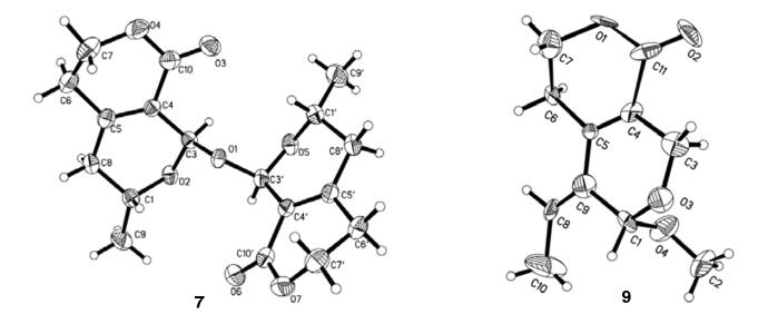 Compound 9 had the molecular formula of C11H14O4 as a result of a positive HRESIMS experiment, with an additional CH2 moiety compared to compound 8. Its IR, UV and NMR spectroscopic data were similar to 8, except for an additional methoxy group. In HMBC spectrum, the correlations of OCH3/C-1 and H-1/OCH3 indicated that the methoxy group was located at C-1 position. Finally, its structure was determined by an X-ray single crystal diffraction experiment.