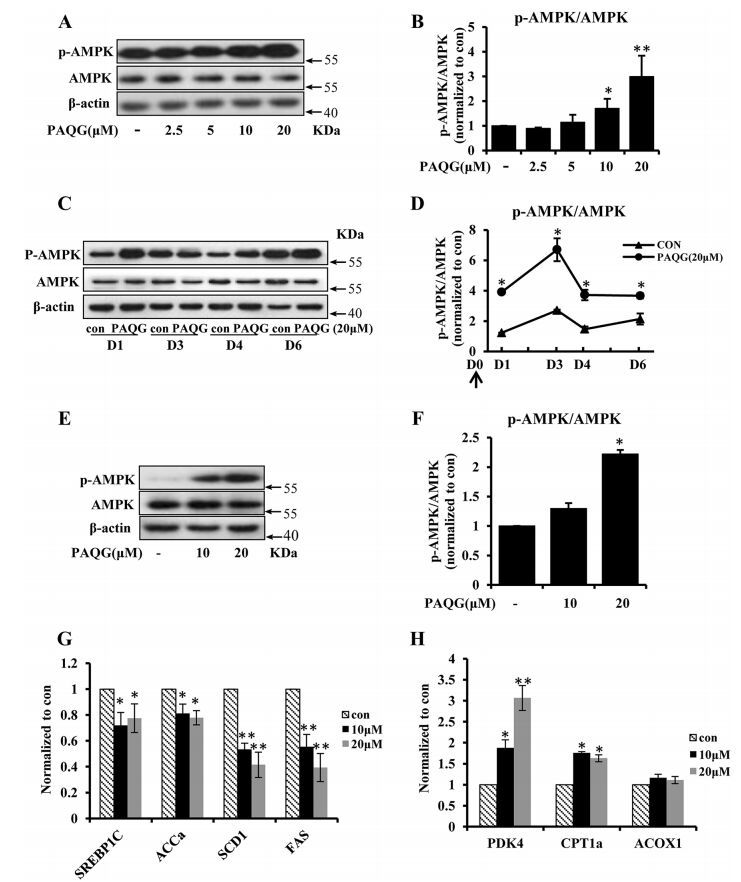 PAQG activates AMPK pathway in 3T3-L1 adipocytes. a 3T3-L1 pre-adipocytes were induced to differentiate in the presence of indicated concentrations of PAQG. 6 days later, the expression of AMPK and p-AMPK were assessed by western blotting and quantitatively analyzed (b). c 3T3-L1 pre-adipocytes were incubated in differentiation medium with 20 μM PAQG or vehicle, the expression of AMPK and p-AMPK were detected at different time during differentiation and quantitatively analyzed (d) (the arrow indicates PAQG treatment). Differentiated 3T3-L1 adipocytes were incubated with indicated concentrations of PAQG for 48 h. e The expression of AMPK and p-AMPK were assessed by western blotting and quantitatively analyzed (f). g The expression of AMPK target genes, (SREBP1c, FAS, ACCα, SCD1) which were connected with fatty acid biosynthesis by real-time PCR. h The expressions of (PDK4, CPT1a, ACOX1) by real-time PCR. Data are presented as mean ± SEM (*p < 0.05, **p < 0.01) from three independent experiments