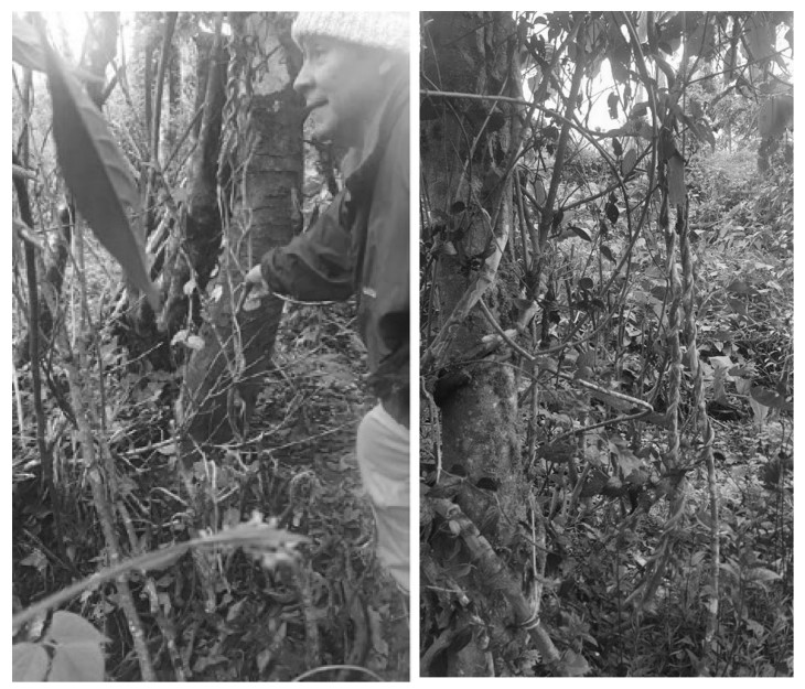 Shaman Juan Mutumbajoy Jacanamijoy showing the lianas of Banisteriopsis caapi (Malpighiaceae) at Vereda Tamabioy, Municipality of Sibundoy, Putumayo, Colombia