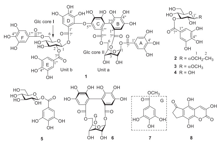 E. griffithii is a robust rhizomatous perennial whose vertical stems dresses in small, red-tinged leaves and showy orange-red flowers in early summer; it is native to Himalayas and western Asia [5, 6]. It has red stems and dark green leaves, which crop up in spring with a reddish tincture [7]. Exhaustive literature search did not show any evidence of previous phytochemical studies on E. griffithii. That notwithstanding, our study on the stems of E. griffithii disclosed the presence of one new hydrolyzable tannin dimer (1) and one new galloyl-glucoside (2), together with six known ones (3–8). Compounds 1–3 were evaluated for their anti-inflammatory effects. Herein, we present the isolation, structural elucidation of the isolates, and bioassay tests of compounds 1–3.