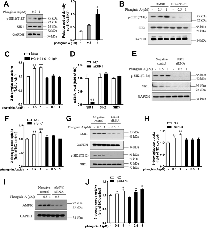Given that phanginin A promoted phosphorylation of the SIK1 at Thr182 in liver, which represented SIK1's activated state, we investigated its effect on SIK1 phosphorylation in skeletal muscle. As expected, Phanginin A notably increased SIK1 phosphorylation at Thr182 in C2C12 myotubes (Fig. 2A). To ascertain whether phanginin A-stimulated glucose uptake relied on SIK1 activation, we utilized the pan-SIK inhibitor HG-9-91-01 to suppress SIK activity. Treatment with HG-9-91-01 completely abrogated both phanginin A-stimulated SIK1 phosphorylation (Fig. 2B) and glucose uptake (Fig. 2C). Following siRNA interference, SIK1 expression was substantially reduced compared to the negative control group, with no discernible changes in SIK2 and SIK3 expression (Fig. 2D). As expected, phanginin A failed to stimulate SIK1 phosphorylation and glucose uptake upon SIK1 silencing (Fig. 1E, F), underscoring the dependence of phanginin A-induced glucose uptake on SIK1. Considering LKB1 as an upstream kinase of SIK1, phosphorylating and activating it [23], we knocked down LKB1 expression via RNA interference in C2C12 myotubes (Fig. 2G). The phanginin A-induced SIK1 phosphorylation and the promotion of glucose uptake were abolished upon knocking down LKB1 (Fig. 2G, H). Although AMPK serves as another substrate of LKB1 and involved in regulating glucose uptake in skeletal muscle, knocking down AMPK did not impede the phanginin A-stimulated glucose uptake (Fig. 2I, J). Collectively, these findings indicate that phanginin A enhances glucose uptake in skeletal muscle through a SIK1-dependent mechanism.