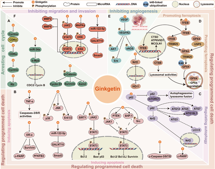 Schematic representation of ginkgetin's partial anticancer mechanisms. A Arresting cell cycle. B Inducing apoptosis. C Regulating autophagy. D Promoting ferroptosis. E Inhibiting angiogenesis. F Inhibiting migration and invasion. The regulatory mechanisms of selected relevant molecules are depicted in the figure
