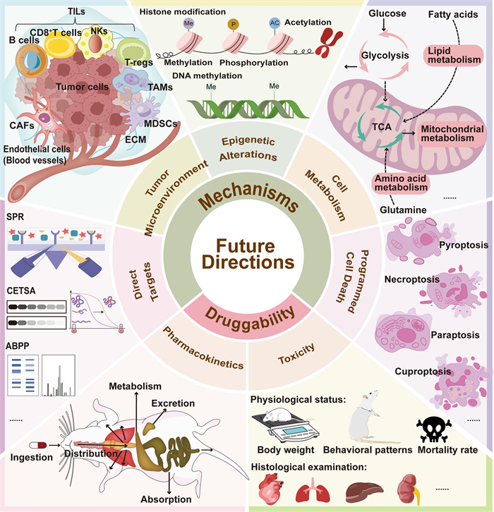 Schematic diagram of future directions in studying ginkgetin. To advance the clinical translation of ginkgetin for cancer therapy, future studies should prioritize pharmacokinetics, toxicity profiling, and deeper exploration of its anticancer mechanisms. Further mechanistic investigations should explore whether ginkgetin modulates additional forms of programmed cell death, influences cancer cell metabolic reprogramming and epigenetic modifications, and remodels the tumor microenvironment. Additionally, identifying direct targets of ginkgetin through advanced techniques is critical to elucidate its mode of action
