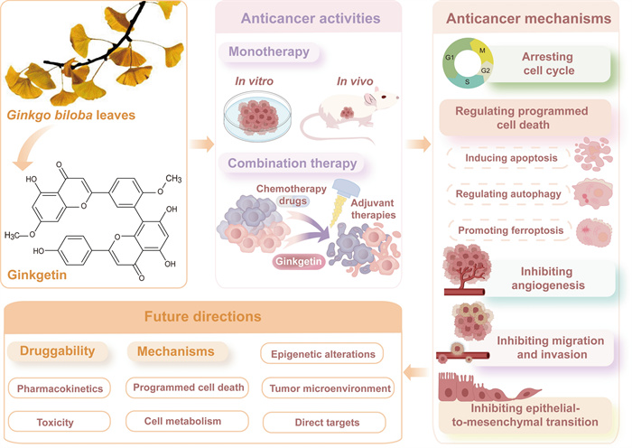 In summary, ginkgetin exerts significant anti-cancer effects through various mechanisms. In the future, further research is needed to enhance its pharmacokinetics and improve its bioavailability to facilitate its translation into clinical applications. In addition, leveraging emerging technologies to gain a deeper understanding of the role of ginkgetin in the tumor immune microenvironment and to identify specific, direct molecular targets are directions worthy of further investigation.