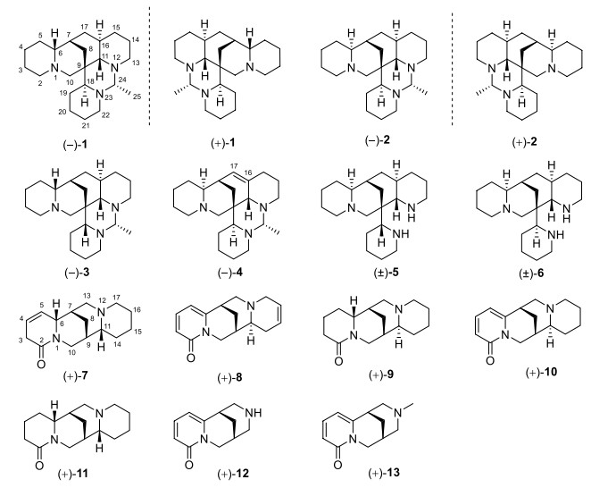 Seven known alkaloids were also isolated. Compounds 5 and 6 were obtained as crystals and identified as enantiomers, as evidenced by their specific rotations of zero. By comparing their spectroscopic data and optical rotations with the reported data in the literatures, the structures of known ones were unambiguously identified as (±)-18-epiormosanine (5) [16–18], (±)-ormosanine (6) [10, 18], (+)-lupanine (9) [10], (+)-anagyrine (10) [19–21], (+)-α-isolupanine (11) [11], (+)-cytisine (12) [22], and (+)-N-methylcytisine (13) [22].
