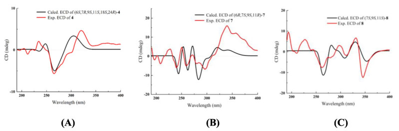 Experimental ECD and calculated ECD spectra of compounds 4, 7, and 8