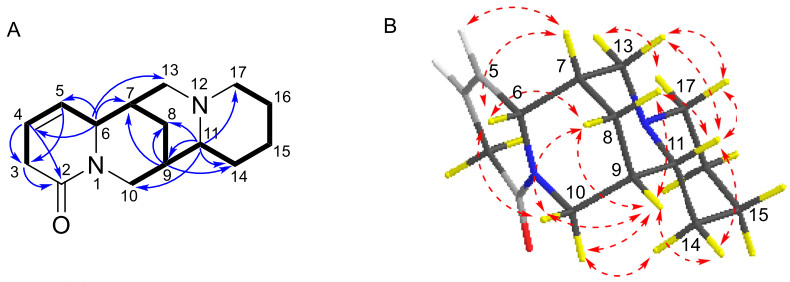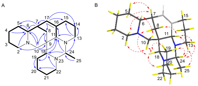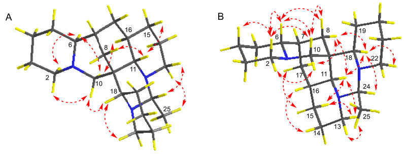 Compound 1 was isolated as colorless crystals. Its molecular formula was determined to be C22H37N3, with six double bond equivalents (DBEs), based on the HRESIMS ion [M + H]+ at m/z 344.3061 (calcd for 344.3065). The 1H NMR and 13C NMR spectrum (Tables 1 and 3) revealed 22 carbon signals for compound 1, consisting of a doublet methyl group [δH-25 1.23 (d, J = 5.5 Hz), δC-25 17.0], 14 methylenes, six methines, and a nonprotonated carbon (δC-9 37.3). The 1H-1H COSY spectrum displayed three spin–spin systems: H-2/H-3/H-4/H-5/H-6/H-7/H-17(H-8)/H-16/H-15(H-11)/H-14/H-13, H-18/H-19/H-20/H-21/H-22, and H-24/H-25 (Fig. 2A). HMBC correlations (Fig. 2A) from H-6 to C-2, C-5, C-8 and C-10 confirmed that rings A and B were fused via N-1 and C-6. Further HMBCs from H-11 to C-8, C-10, C-13, C-16, and C-17 indicated rings B and D were connected through ring C. Ring E was positioned adjacent to rings C and D, as evidenced by HMBC correlations of H-11/C-8, C-10, C-13, C-24, and H-24/C-13. The connectivity of ring F to ring E was corroborated by the HMBC cross-peaks of H-18/C-9, C-24, and H-22/C-24. The planar structure of 1 was closely related to the known ormosia-type quinolizidine alkaloid, homoormosanine [10]. The primary difference in their 1D NMR spectra between them was the presence of an additional doublet methyl (C-25) signal in 1, which was assignable to C-24 supported by the HMBC correlations from CH3-25 to C-24.