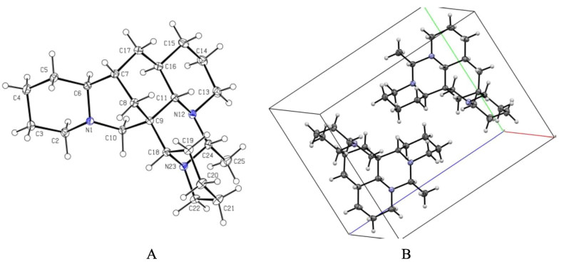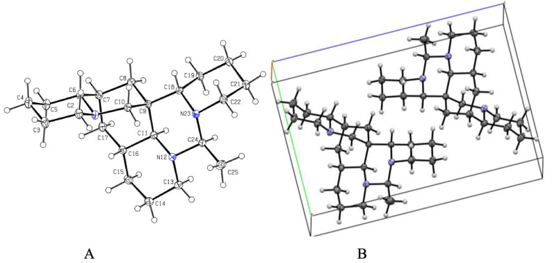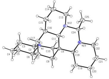 Compound 3 was isolated as colorless crystals, and its molecular formula was determined to be C22H37N3 based on the HRESIMS data, which showed an [M + H]+ ion peak at m/z 344.3060 (calcd for 344.3065). The 1D NMR spectroscopic data (Tables 1 and 3) for 3 were consistent with those of 1, suggesting that 3 also shared the same planar structure as 1. The relative configuration of 3 was established as shown in Fig. 3B by ROESY correlations of H-2β/H-4, H-6/H-2β, H-6/H-10β, H-6/H-8β, H-10β/H-2β, H-10β/H-8β, H-8α/H-11, H-2α/H-10α, H-8α/H-18, H-8α/H-17β, H-18/H-11, H-18/H-24, H-18/H-22β, H-11/H-13β, H-13β/H-15β, H-11/H-15β, H-16/H-14α, H-17α/H-15α, CH3-25/H-13α. The absolute configuration of 3 was finally determined by single crystal X-ray diffraction analysis with CuKα radiation (Fig. 8). The Flack parameter of 0.04 (6) [13] established unambiguously the absolute configuration of 3 as 6R, 7R, 9S, 11S, 16R, 18R, 24R, and the compound was named ormohenin C.