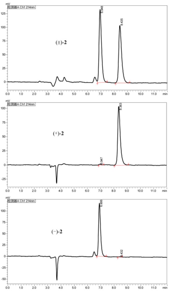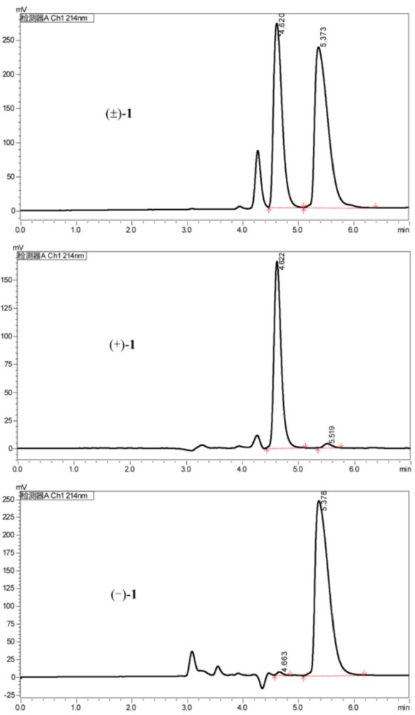Subsequently separation of 1 by semi-preparative HPLC using a normal phase chiral column (Chiralpak IE) and eluting with n-hexane/EtOH/DEA (80: 20: 0.1) obtained (+)-1 (flow rate 1.0 mL/min, tR = 4.62 min) and (−)-1 (tR = 5.37 min), respectively. Separation of 2 by semi-preparative HPLC using a reverse phase chiral column (Chiralpak IF) and eluting with EtOH/DEA (100: 0.1) obtained (+)-2 (flow rate 1.0 mL/min, tR = 6.91 min) and (−)-2 (tR = 8.38 min), respectively.