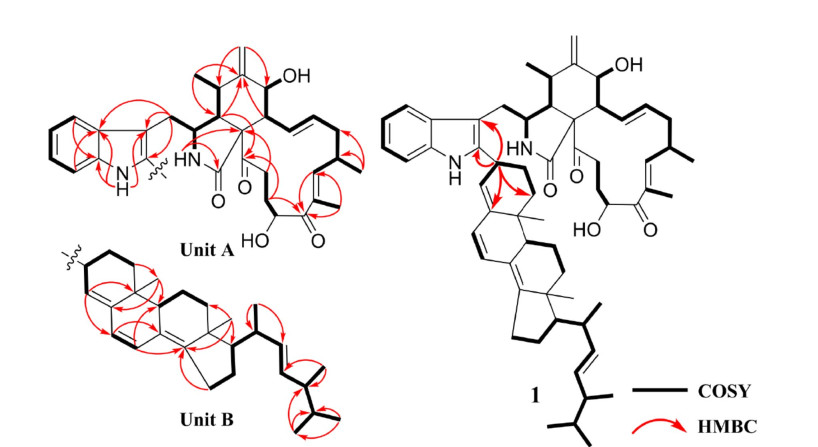 Chalasoergodimer A (1) was isolated as a brown powder. Its molecular formula was determined to be C60H78N2O5, indicating 23 degrees of unsaturation, based on the HRESIMS ion peak at m/z 929.5818 [M + Na]+ (calcd for C₆₀H₇₈N₂O₅Na+, 929.5808). The 1H NMR and HSQC spectra (Table 1 and Fig. S7) revealed the presence of an indolyl moiety, characterized by four coupled aromatic protons at δH 7.40 (d, 1H, J = 7.8 Hz), 7.28 (d, 1H, J = 7.8 Hz), 7.14 (dd, 1H, J = 7.8, 7.8 Hz), and 7.11 (dd, 1H, J = 7.8, 7.8 Hz). Eight non-terminal olefinic protons were observed at δH 6.31 (dd, 1H, J = 13.8, 9.6 Hz), 6.26 (d, 1H, J = 9.6 Hz), 6.19 (d, 1H, J = 9.6 Hz), 5.98 (d, 1H, J = 9.6 Hz), 5.51 (d, 1H, J = 4.8 Hz), 5.39 (ddd, 1H, J = 14.4, 10.8, 2.4 Hz), and two signals at δH 5.24 (dd, 1H, J = 15.6, 7.2 Hz). Two terminal olefinic protons appeared at δH 5.32 (s, 1H) and 5.13 (s, 1H). Nine methyl groups were detected at δH 1.87 (s, 3H), 1.10 (d, 3H, J = 6.6 Hz), 1.06 (d, 3H, J = 6.6 Hz), 1.06 (d, 3H, J = 6.6 Hz), 0.96 (s, 3H), 0.95 (s, 3H), 0.94 (d, 3H, J = 7.8 Hz), 0.85 (d, 3H, J = 6.6 Hz), and 0.84 (d, 3H, J = 6.6 Hz). The 13C NMR (Table 1) and HSQC spectra displayed 60 carbon signals, including two ketone carbonyls (δC 208.0 and 203.7), one amide carbonyl (δC 173.6), 22 olefinic carbons, two oxygenated carbons (δC 71.5 and 70.2), and 33 aliphatic carbons. The planar structure of 1 was further confirmed by analysis of 1H-1H COSY and HMBC spectra (Fig. 2). The 1H-1H COSY correlations of H-4′/H-5′/H-6′/H-7′, together with HMBC correlations from NH-1′ to C-1′a, C-3′, C-3′a, from H-4′ to C-1′a, and from H-7′ to C-3′a, suggested that the indole moiety contained only five hydrogen atoms. The 1H-1H COSY correlations of H-2/H-3/H-4/H-5/H-11, H-7/H-8/H-13/H-14/H-15/H-16/H-17, and H-20/H-21/H-22, along with the HMBC correlations from NH-2 to C-1, C-9, from H-4 to C-6, C-23, from H-12 to C-5, C-7, from H-17 to C-19, C-25, and from H-21 to C-19, C-23, further established unit A as the C-2′ dehydrogenated derivative of chaetoglobosin Fex (9). The characteristic structure included amide group at C-1, carbonyl groups at C-19 and C-23, a terminal alkene at C-12, and a hydroxyl group at C-20. In the structure of unit B, 1H-1H COSY correlations of H-1′′/H-2′′/H-3′′/H-4′′, H-6′′/H-7′′, H-9′′/H-11′′/H-12′′, H-15′′/H-16′′/H-17′′/H-20′′/H-22′′/H-23′′/H-24′′/H-25′′/H-26′′, together with HMBC correlations from H-3′′ to C-5′′, from H-4′′ to C-6′′, C-10′′, from H-6′′ to C-8′′, from H-7′′ to C-9′′, C-14′′, and from H-18′′ to C-12′′, C-14′′, C-17′′, indicated that unit B possessed a ergosta-4, 6, 8(14), 22-tetraen-3β-ol skeleton [30] substituted at C-3′′. Moreover, the key HMBC correlations from H-3′′ to C-2′, C-3′, along with the absence of a proton signal at C-2′ in the HSQC spectrum, suggested that the planar structure of 1 consisted of chaetoglobosin Fex and ergosta-4, 6, 8(14), 22-tetraen-3β-ol moiety, connected through a C–C single bond between C-2′ and C-3′′, with the hydroxyl group at C-3′′ eliminated.