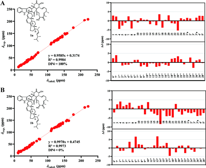 B Linear Regression analysis, DP4 analysis and subtraction of the experimental and calculated 13C NMR chemical shifts of 1b