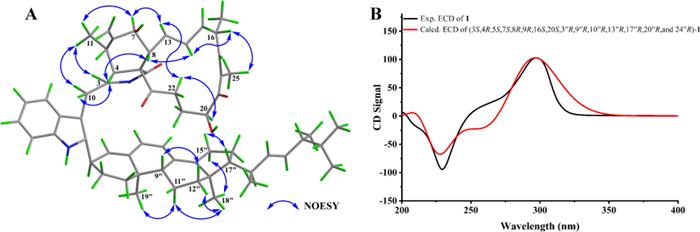 A Key NOESY correlations and B experimental versus calculated ECD spectra of 1